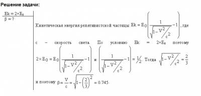 | Quote (Cornelian_cherry) ТАм надо двойку убрать же хД там не удвоенная энергия покоя хД MisterY, Для тела, обладающего массой m релятивистский импульс p-mv/sqr(1-v^2/c^2) (*) (m-масса тела, v-скорость движения теля, c-скорость света в вакууме). Полная энергия в состоянии движения (релятивистская энергия тела) E=sqr(p^2c^2+m^2c^4). Собственная энергия тела в состоянии покоя E0=mc^2. Кинетическая энергия тела Ек=Е-Е0. В Вашем условии Ек=Е0, т.е. pc=mc^2. Подставляем выражение для р (*). Находим v/c=1/sqr2. Я на этот вопрос отвечал (спрашивай.ру)